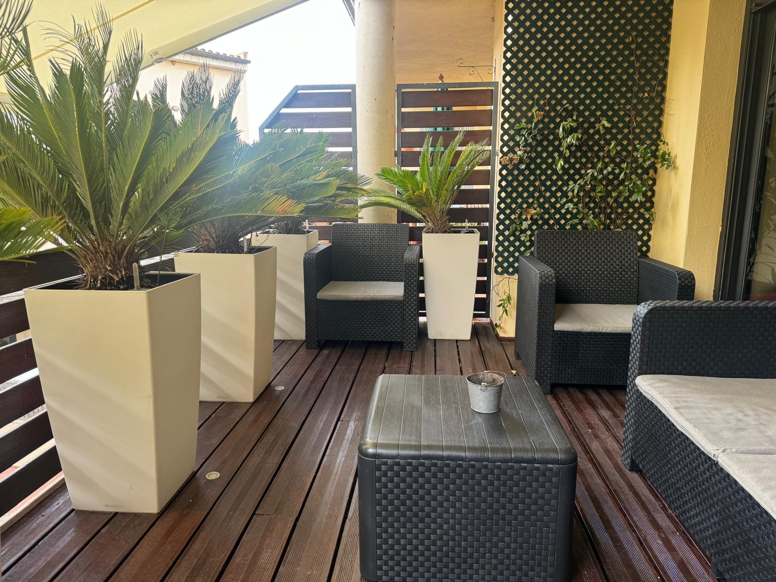 Gran terraza de 15 m² con toldo automático nuevo, ideal para comidas y cenas al aire libre